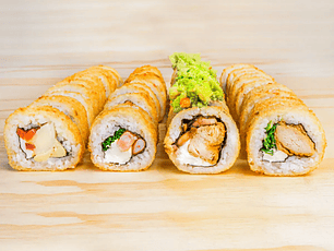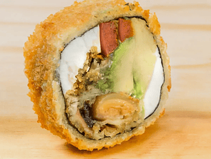 Salmón, camarón, camote furai, queso crema y palta envuelto en palta